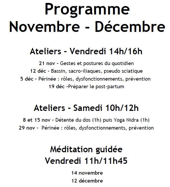 Yoga prénatal et postnatal : Lundi 17h/18h - séances hebdomadaires prénatal (en petit groupe). Samedi 10h/12h - 10 oct, 29 nov, 6 déc, 10 janv - atelier prénatal ou postnatal