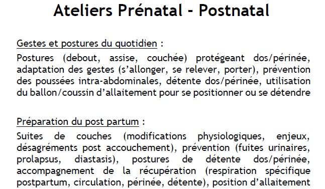 Dates : 6 fév 14h (gestes et postures), 28 fév 10h (périnée 'bases'), 14 mars 10h (périnée 'gestion des efforts'), 28 mars (périnée 'renforcement et abdo'), 3 avril 14h (postpartum).