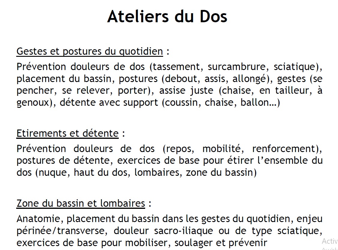 Ateliers "Santé et Prévention" Vendredi 14h/16h et Samedi 10h/12h. Accessible à tous (sans pré-requis yoga nécessaire). Participation "à la séance" sur réservation préalable (1 ou plusieurs dates). Approche posturo-respiratoire 'de Gasquet'. Prochaines dates : sam 14 mars (périnée n°2 gestion des efforts), sam 28 mars (périnée n°3 renforcement et abdo), sam 25 avril (dos - étirement et détente)