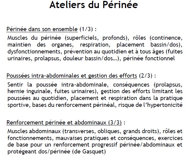 Dates : 6 fév 14h (gestes et postures), 28 fév 10h (périnée 'bases'), 14 mars 10h (périnée 'gestion des efforts'), 28 mars (périnée 'renforcement et abdo'), 3 avril 14h (postpartum).